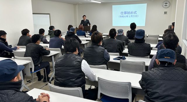 朝8:00より全従業員(関東メンバーを除く)が集まり3階会議室で「仕事始め式」を行いました。その後8:30より第1回の「安全衛生委員会」、13:00からは「作業員に対する2024年問題対策の説明会」、15:00からは「班長会」を行いました。新年初日は会議、会議で粛々と1日が終わりました。