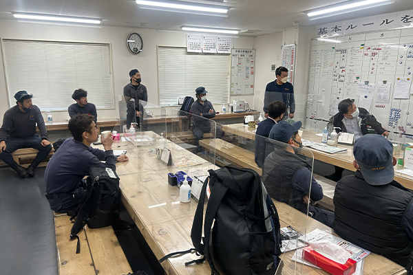 出発前に朝礼を行い、作業の進め方や現場での危険事項、出発点呼(体調管理)の確認を行います。